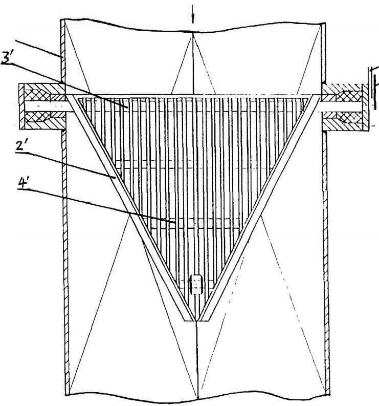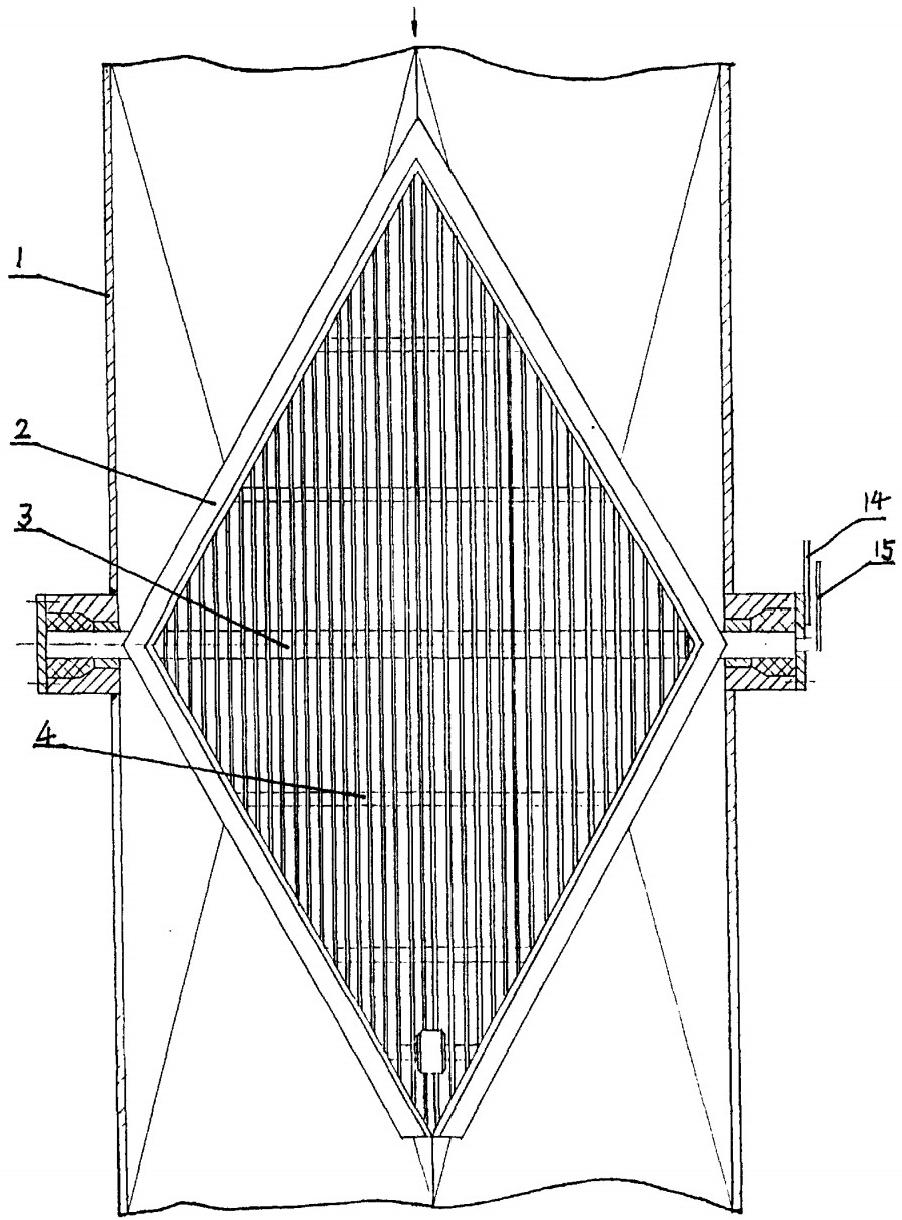 本凝汽器膠球清洗裝置收球網(wǎng)旋轉(zhuǎn)裝置中,操縱裝置為人工動(dòng)力,其中設(shè)有棘輪12、12和棘爪13、13.適用于各種形狀的收球簡體,包括圓簡狀、棱柱筒狀等.通過操作操縱裝置,可使柵格網(wǎng)板轉(zhuǎn)到適當(dāng)位置,從而完成其功能。當(dāng)柵格網(wǎng)板將收球簡體的截面封住時(shí)(此時(shí),菱形柵格網(wǎng)板呈傾斜面狀,而兩個(gè)三角形的柵格網(wǎng)板對(duì)稱形成A字形),則運(yùn)行收球工況,膠球從引球口流出;當(dāng)柵格網(wǎng)板轉(zhuǎn)到與水流平行時(shí),便是柵格網(wǎng)板的自動(dòng)清洗工況.