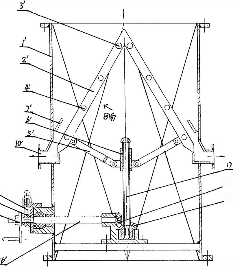 如圖3、4所示,凝汽器膠球清洗裝置收球網(wǎng)旋轉(zhuǎn)裝置,包括收球簡體1,柵格網(wǎng)板2、轉(zhuǎn)軸3、膠球引出口10、導(dǎo)流板7、傳動(dòng)裝置和操縱裝置11,其收球簡體1為四棱狀。本實(shí)用新型所述收球網(wǎng)的旋轉(zhuǎn)裝置中,每塊網(wǎng)板上各有一轉(zhuǎn)軸3,兩塊網(wǎng)板2對(duì)稱布置,柵格網(wǎng)板2的下面各有一支撐臂5,支撐臂5通過傳動(dòng)裝置與收球簡體1外的操縱裝置11相連。傳動(dòng)裝置為螺桿、齒輪傳動(dòng)裝置,支撐臂S與位于縱螺桿17上的移動(dòng)塊6鉸鏈,縱螺桿17下端的傘齒輪19°與動(dòng)力傳動(dòng)桿16上的傘齒輪18相嚙合。