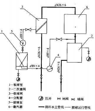 膠球系統投入運行時一般投球數量為凝汽器單測單流程銅管數的7%~13%,每次運行1h,收球率在95%以上。