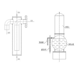 (3)當(dāng)除氧器內(nèi)的蒸汽過多而使除氧器內(nèi)部壓力超過正常工作壓力時,多余的蒸汽可以通過溢流裝置排出,使除氧器泄壓,防止除氧器因超壓發(fā)生危險。溢流水封裝置結(jié)構(gòu)及安裝圖如圖