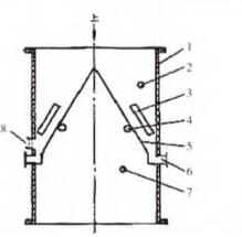 圖4改造后的A形雙箭式收球網(wǎng)縱剖面結(jié)構(gòu)注:1捕環(huán)水管管壁;2網(wǎng)前測壓點(diǎn);3導(dǎo)流.板.;4軸;5網(wǎng)板;6脫球引出管;7網(wǎng)后測驗點(diǎn);8觀寨孔
