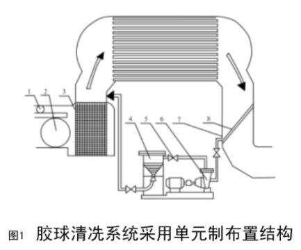 電廠#1、#2機組凝汽器膠球清洗裝置系統(tǒng)采用凝汽器清洗裝置,該膠球清洗裝置主要由兩臺125JQ-15型膠球泵,兩臺EW/800II型二次濾網(wǎng)、SF-1800收球網(wǎng)和ZQ-24裝球室組成。本膠球清冼系統(tǒng)采用單元制布置,這種布置方式可對凝汽器兩側(cè)同時清洗。1、排污閥2、清洗蝶閥3、二次濾網(wǎng)4、裝球室5、球閥6、膠球泵7、收球網(wǎng)8、收球網(wǎng)板操作機構(gòu)。